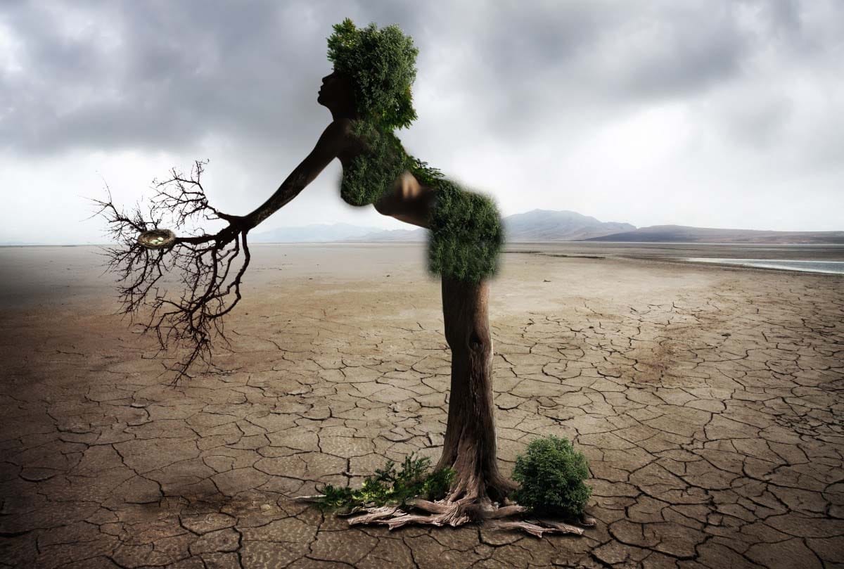 درمیان میں ایک درخت کی مانند عورت کھڑی تھی۔ اس کا جسم انسانی تھا مگر جڑوں کے ساتھ زمین سے جڑا ہوا تھا۔ اس کے بال سبز پودوں کی مانند تھے، اور اس کے ہاتھ ایک سوکھی ہوئی شاخ کی شکل اختیار کیے ہوئے تھے۔ اس کی شاخوں میں ایک پرندے کا گھونسلہ جھول رہا تھا، جیسے زندگی کی کوئی آخری امید ہو۔