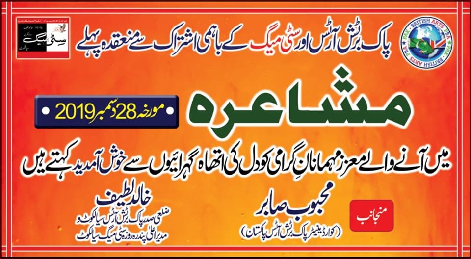 پاک برٹش آرٹس اور پندرہ روزسٹی میگ کے باہمی اشتراک سے ایک پُرشکوہ ، باوقار اور کامیاب ترین پہلے مشاعرہ کا انعقاد محبوب پبلک سکول ( پی بی اے سینٹر) کشمیر روڈ سیالکوٹ میں کیا گیا- تقریب کی صدارت مُلک کے نامور شاعر جناب ثناء اللہ ظہیر نے فرمائی